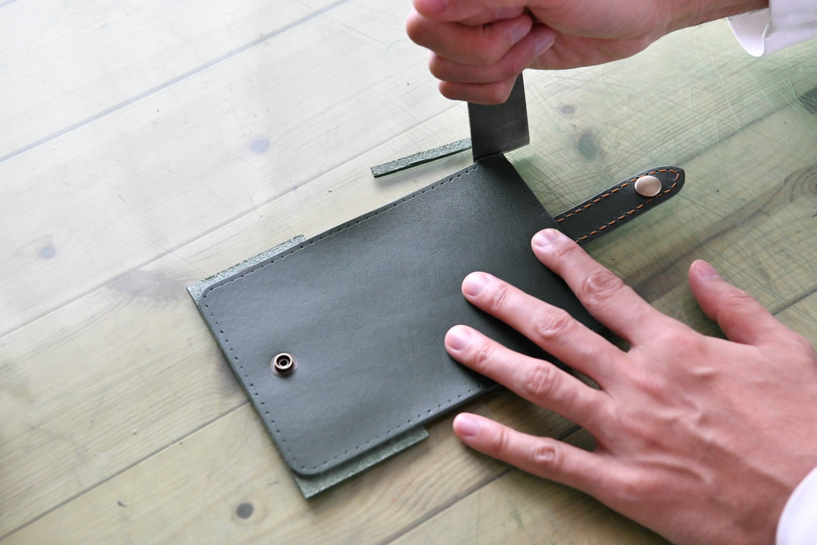 構造はすべて平面で、レザークラフトの基本である「切る・貼る・縫う」を気軽に試せるシンプルなつくり。ベルト部分にジャンパードットを取り付ける工程があるため、“少しだけステップアップしたい方”にも楽しんでいただけます。